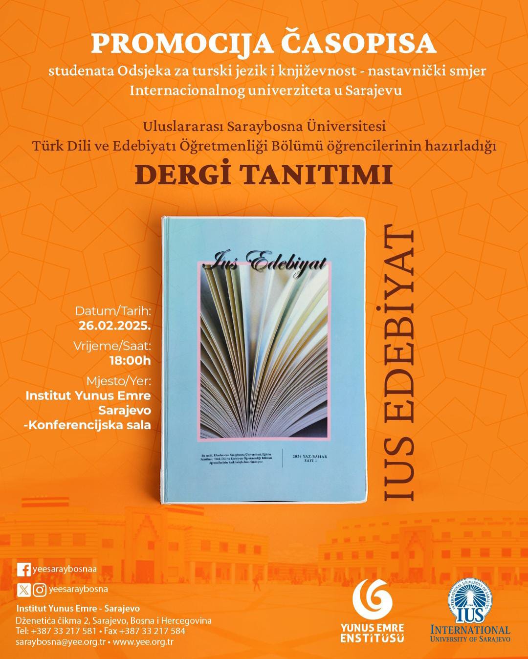 Geçtiğimiz eğitim-öğretim yılında Bosna-Hersek Saraybosna’da Uluslararası Saraybosna Üniversitesi Eğitim Fakültesi Türk Dili ve Edebiyatı Öğretmenliği Bölümü’nde Millî Eğitim Bakanlığına bağlı olarak okutmanlık görevi yapan Ankay Kardaş, görev yaptığı süre içerisinde Bosna-Hersekli öğrencileriyle IUS Edebiyat adlı dergiyi, editörlüğünü yürüterek hazırladı. Derginin tanıtımı Saraybosna Yunus Emre Enstitüsü’nde gerçekleştirildi. Tanıtıma, Uluslararası Saraybosna Üniversitesi Rektörü Prof. Dr. Ahmet Yıldırım, Kurucu Vakıf Yönetim Kurulu Başkanı Hasan Topaloğlu, Rektör Yardımcısı Doç. Dr. Yasir Göz, Saraybosna Yunus Emre Enstitüsü Müdürü Mehmet Akif Yaman, Gebze Belediye Başkanı Zinnur Büyükgöz, Eğitim Fakültesi Dekanı Doç. Dr. Almasa Mulalić, Türk Dili ve Edebiyatı Bölüm Başkanı Dr. Dženana Bračković, öğretim üyeleri, öğrenciler ve konuklar katıldı. Tanıtıma çevrimiçi bağlanarak konuşma yapan dergi kurucusu Doç. Dr. Ankay Kardaş, IUS Edebiyat’ın öğrencilerinin çabasıyla ortaya çıktığını, bu çabayla yabancı bir dilde dergi içeriği hazırlamaktan mutluluk duyduğunu, derginin devam etmesini umduğunu belirtti. Dergide, öykü, masal, derleme, deneme, şiir, edebiyat haberleri, Türkçeden Boşnakçaya ve Boşnakçadan Türkçeye çeviri şiirler yer alıyor.